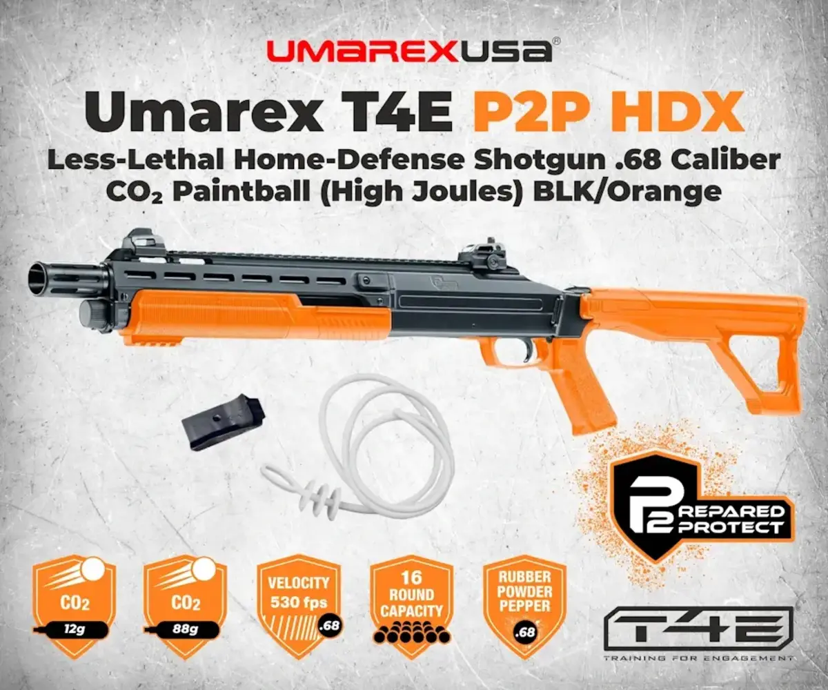 Extreme Less-Lethal Protection at 530 FPS: The Umarex P2P HDX 68 is a .68 caliber CO₂-powered pump-action shotgun designed for high-impact, non-lethal home defense. Now confirmed to fire at up to 530 FPS, this imposing platform delivers serious stopping power with rubber, pepper, or powder rounds—making it one of the most formidable Prepared 2 Protect® options available.