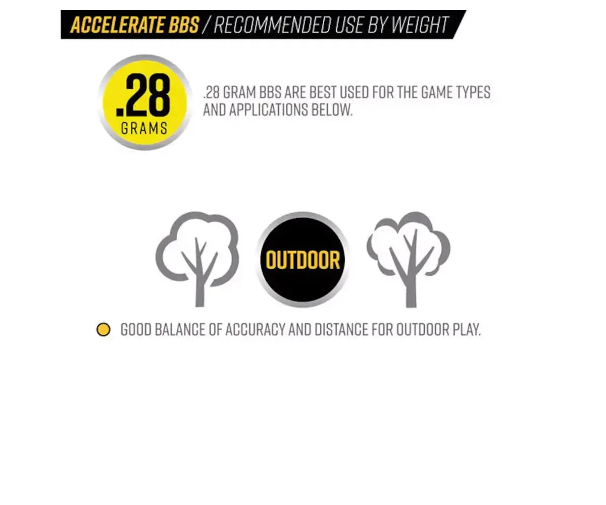 Valken Accelerate ProMatch 0.28g 5000ct 6mm Airsoft BBs are non-biodegradable ABS BBs manufactured in Taiwan to refined 5.95mm ± 0.01mm tolerances. The 0.28g weight delivers a strong balance of range and stability, making it a preferred choice for outdoor play and higher-velocity builds around 380 FPS and above (chronographed with 0.20g BBs).