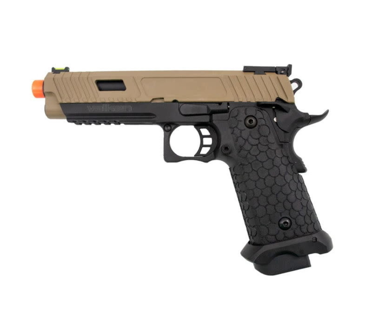 The Valken BY Hi-Capa Co2 Blowback Pistol is a solid and dependable gas blowback airsoft pistol at an affordable price. The Valken Hicapa CO2 airsoft pistol is a double stack, medium-capacity sidearm that has some great external features, including a ported slide to help the slide cycle faster and a lower rail to attach a multitude of accessories. The HiCapa pistol also comes with an aggressive stippling pattern for improved and slip-resistant grip, and a flared magwell to aid in quick reloads. We also recommend the Valken BY HICAPA Co2 Spare Magazine for use with this Valken pistol.