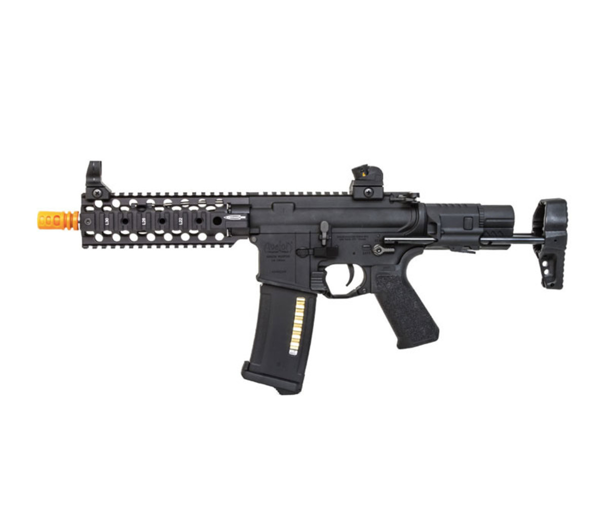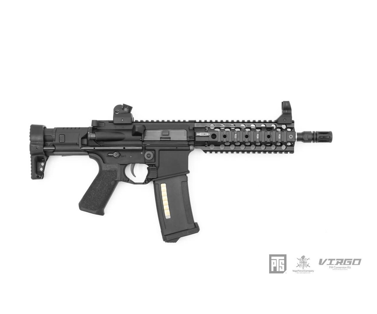 The Virgo System offers players the ability to program firing mode combinations from semi, burst, and full-auto fire modes! This in combination with a very light trigger, factory high-speed steel gears, and a high torque motor give the Mk1 competitive semi-auto fire for CQB, and up to 25rps with 11.1v lipo batteries right out of the box. Field players wanting more power won't be left out either as the Virgo Mk1 features a quick change spring guide for upgrading spring and an updated rotary hop-up unit giving this PDW style AEG range far above its size. Externally the PTS Centurion C4 rail gives space for just about any accessory or mount, in addition to providing an uninterrupted 12 o'clock top rail for optics. Finally, PDW style stock allows for tight cornering when collapsed, and springs out for fast engagement when stability is required.