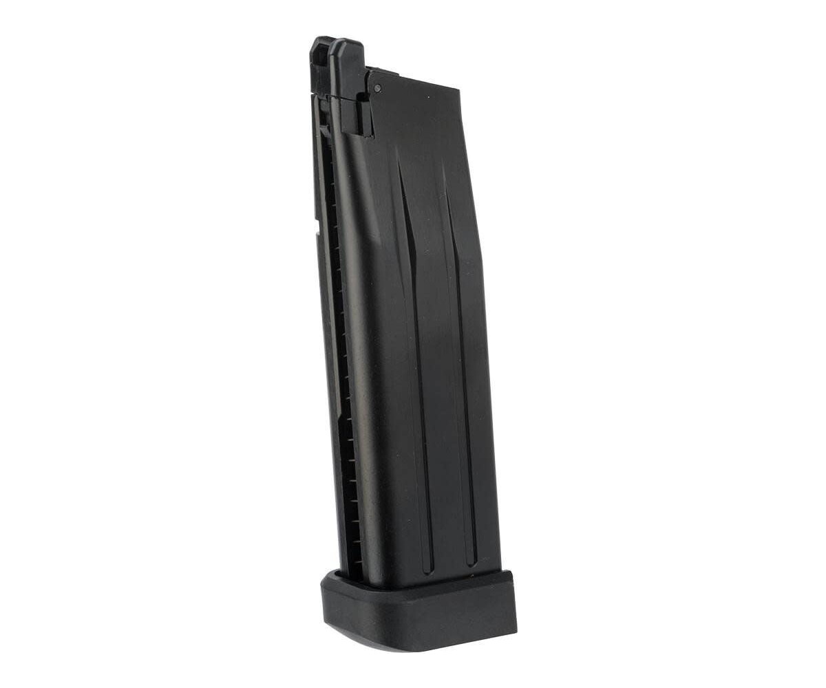 This mag holds 30 rounds and features a high-tension spring that feeds BBs smoothly into even the snappiest custom builds. It’s compatible with WE-Tech, Tokyo Marui, Armorer Works, and most TM-clone Hi-Capa pistols, making it a versatile choice whether you’re running a stock sidearm or a fully upgraded race gun. Fill it with Green Gas, Red Gas, or Propane depending on your setup and game-day conditions — it’s built to handle the pressure.