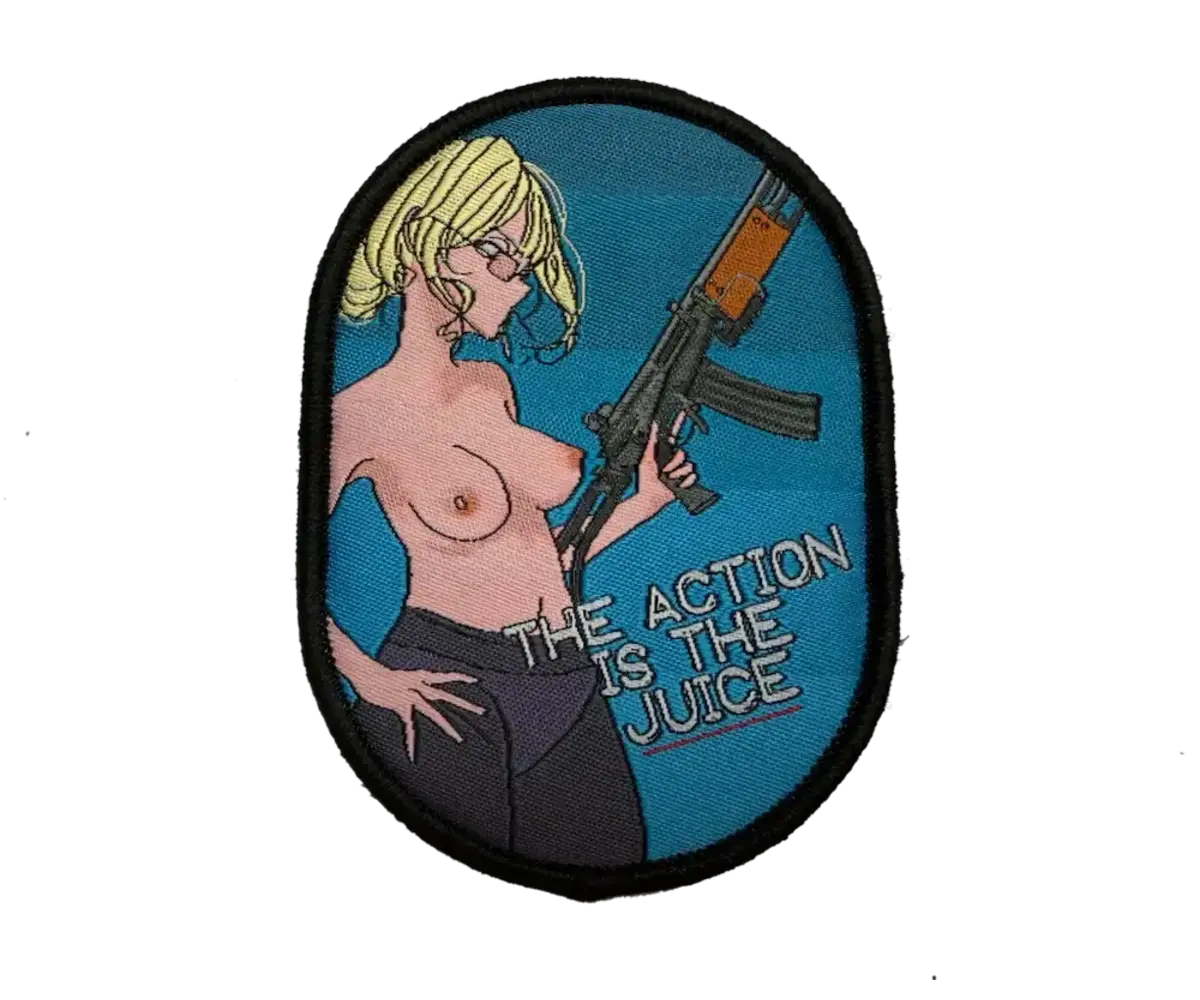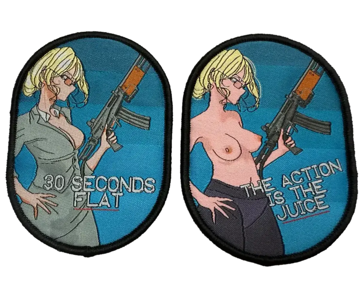 Available in both SFW (“30 Seconds Flat”) and NSFW (“The Action Is the Juice”) versions, the Heat Gisele patch brings cheeky artwork, high-quality woven construction, and hook-and-loop backing for quick mounting. Designed by artist BreechBrookie and produced by Weapons Grade Waifus, this patch captures the spirit of the film while doubling as a fun collectible for fans of anime-style tactical art.