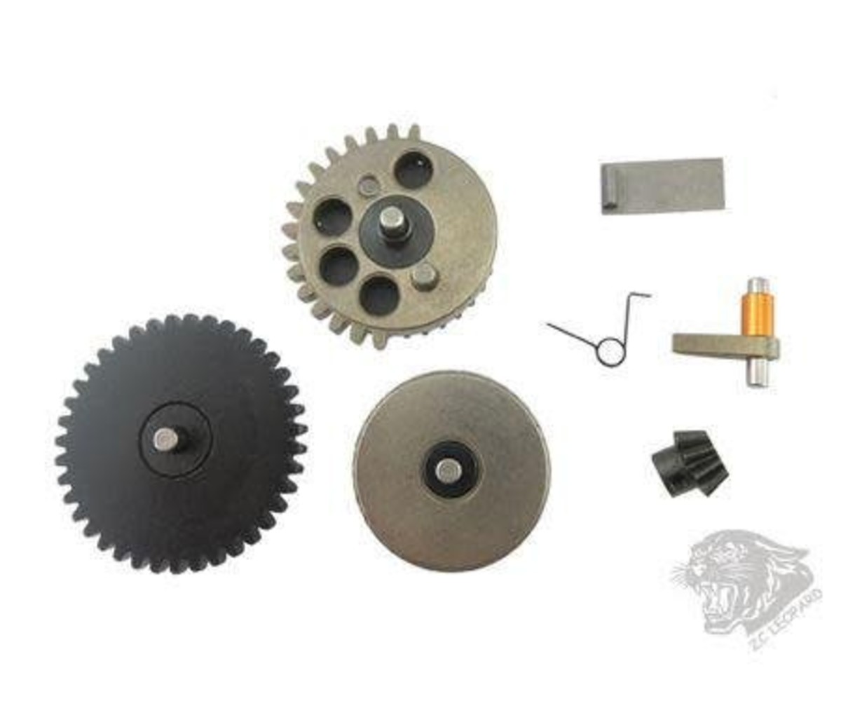Standard 18:1 CNC steel gears that work with standard gearbox series. The gear set also comes with an anti reversal latch with spring and pinion gear. These standard gears are a slight upgrade in some guns that will give you a little bit more longevity with your gear set.